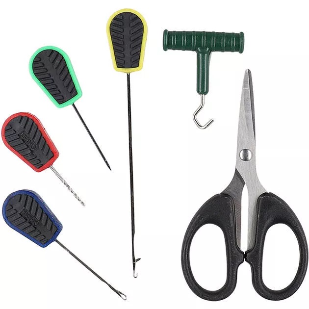 Необходимый в карповой ловле набор игл для бойлов, вместе с ножницами для плетенки и сверлом для бойлов.
